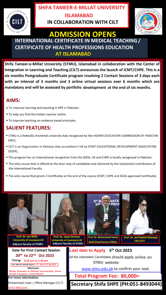 A faculty development seminar was organized by the Department of Health Professions Education (DHPE) at Shifa College of Medicine, titled “Beyond Textbooks: Navigating Digital Learning Landscapes in Medical Education”, on Saturday 26th August 2023. This session was moderated by Dr. Shazia Irum, Assistant Professor-Department of Health Profession Education. Professor Dr. Abida Shaheen and Professor Dr. Fahad...Read More