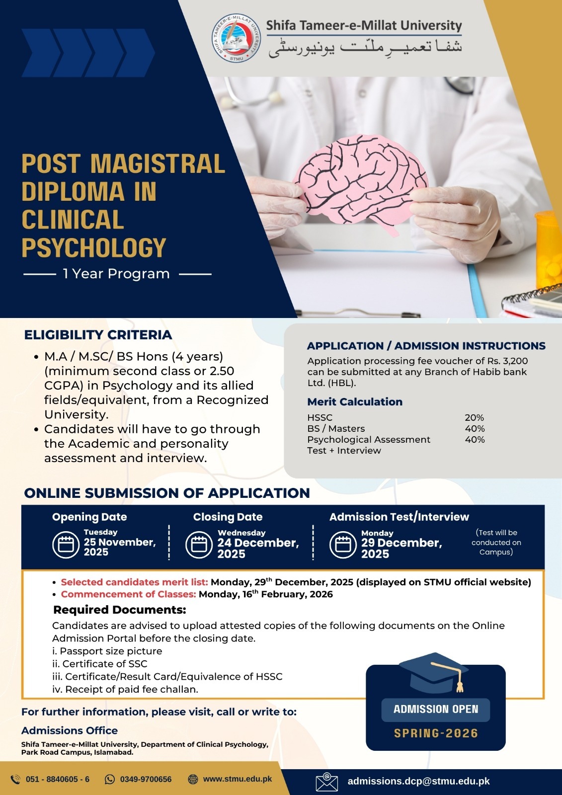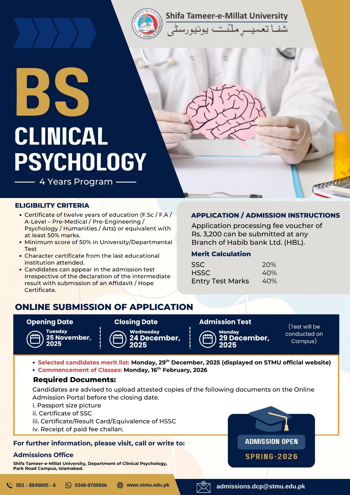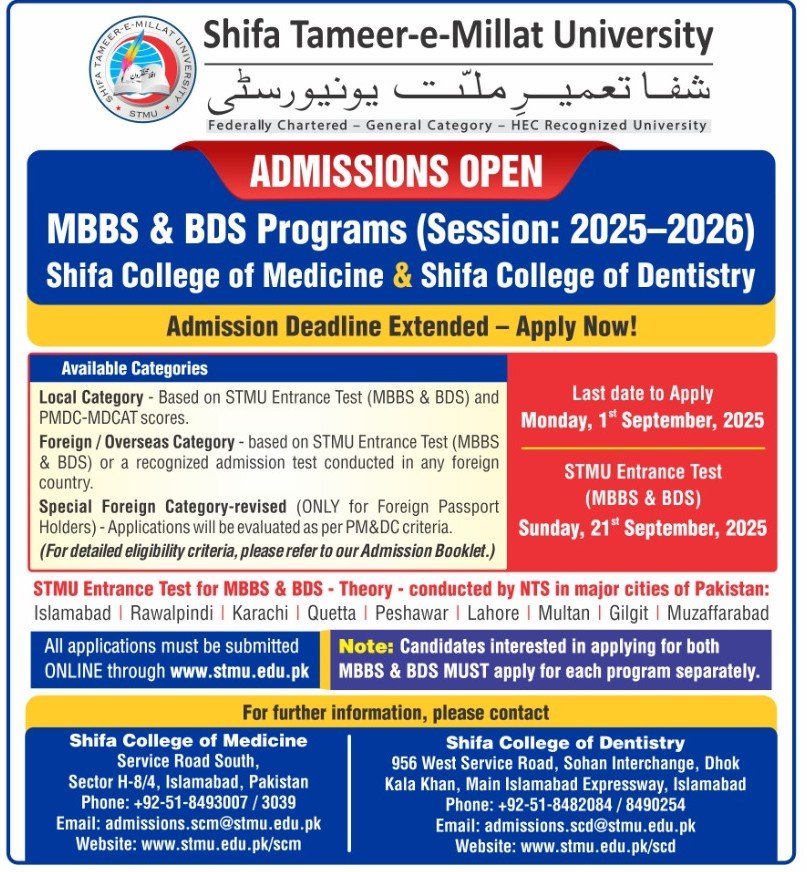 At Shifa Tameer-e-Millat University, we enroll students from across Pakistan and prepare them to lead in their chosen fields. Students at the university enjoy mentorship from foreign qualified professors and have a direct line to unparalleled opportunities.