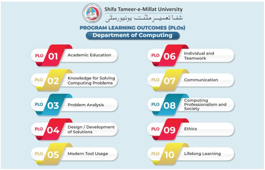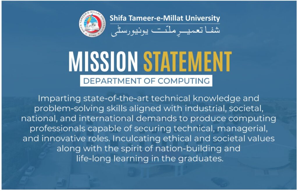 The Department of Computing at Shifa Tameer-e-Millat University has been providing quality education using the latest tools and technologies to enhance the learning. The department has adopted the Outcome based Education (OBE) model. The mission statement, PEOs, and PLOs are mentioned below.