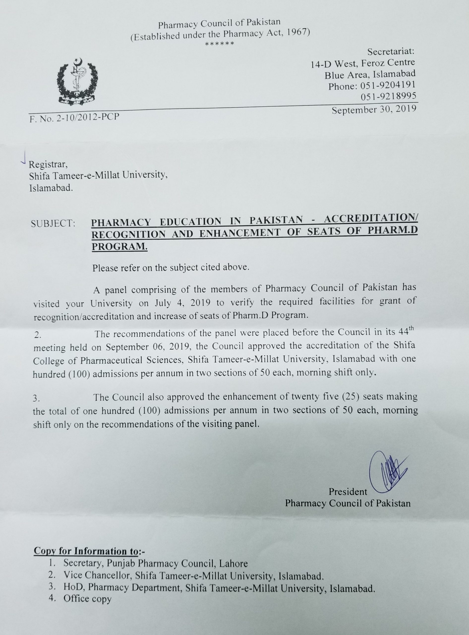 The Doctor of Pharmacy (Pharm.D.) program offered at Shifa Tameer-e-Millat University (STMU) through Shifa College of Pharmaceutical Sciences (SCPS) has been accredited by the Pharmacy Council of Pakistan (PCP). The PCP concerning itself with the quality assurance and quality enhancement, looked at curriculum, faculty, assessment system, lab facilities, clinical/ attachment facilities, and overall teaching & learning environment. The PCP using both quantitative and qualitative parameters found quality of Pharm. D. program being offered at SCPS beyond minimum requirements/ expectations of different accreditation standards and encouraged the management for continued improvement thereof.