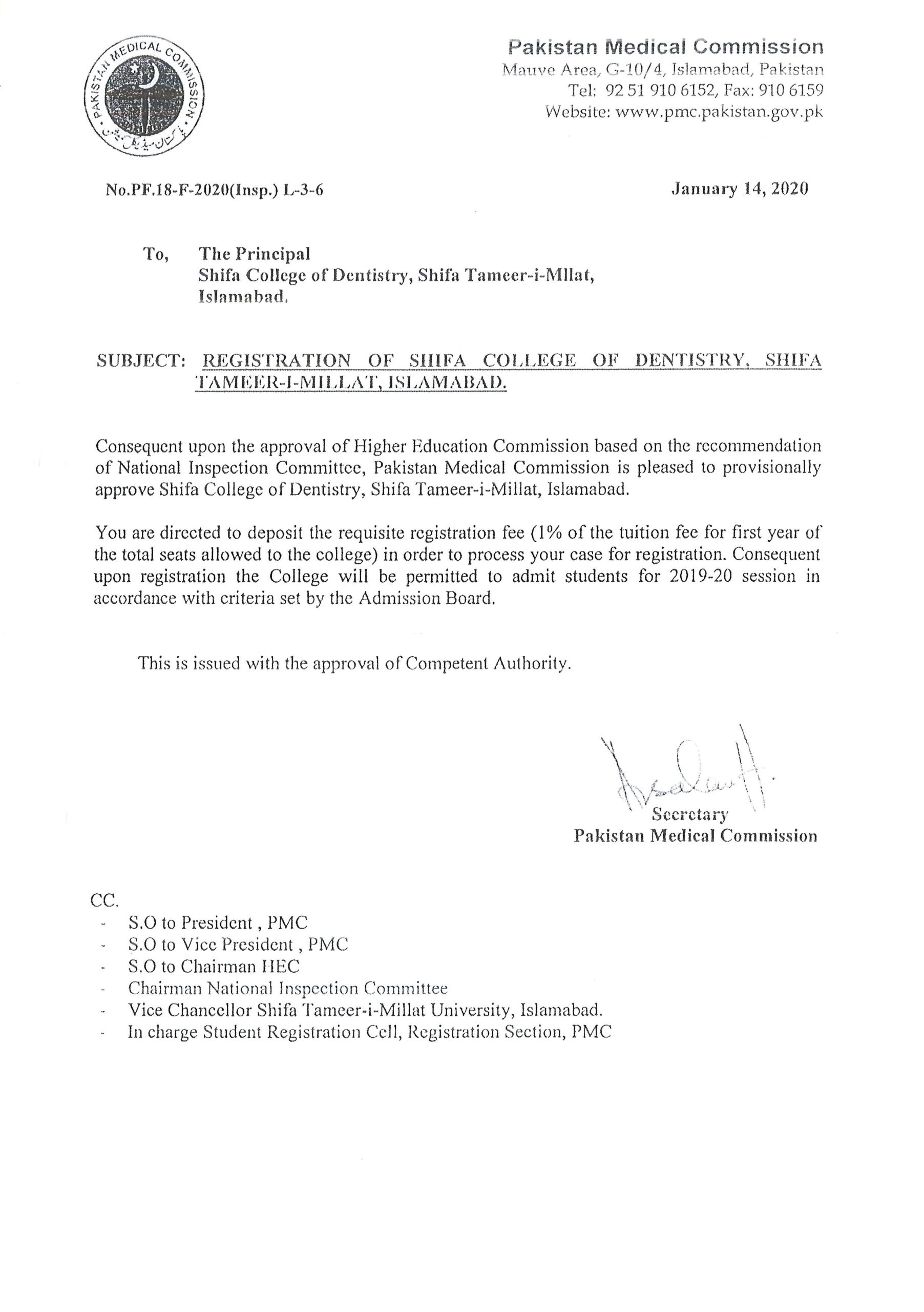 The Bachelor of Medicine; Bachelor of Surgery (MBBS) program offered at Shifa Tameer-e-Millat University at its constituent unit, Shifa College of Medicine is duly accredited by Pakistan Medical and Dental Council (PM&DC).