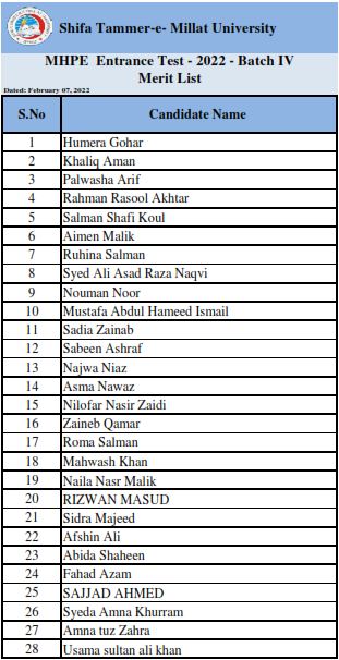 Shifa School of Health Professions Education Merit List