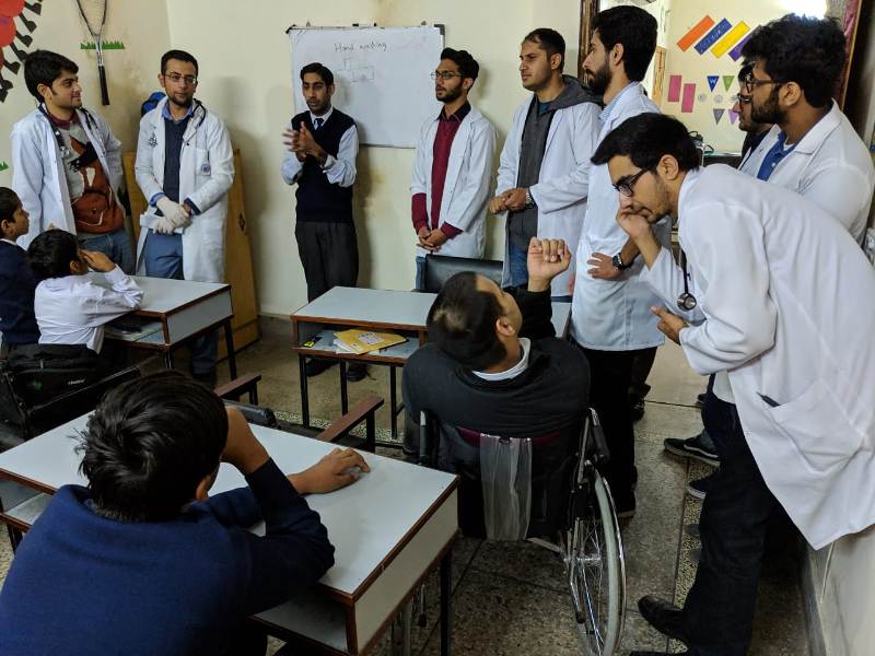 Students distributed snacks, fruits and milk packs among children. and also demonstrated hand washing technique. Few gave donations to the foundation and one student also distributed multivitamins supplements to every school student. At the end , medical students were served refreshments and a highly informative session was given by Mrs. Naema Bushra Malik ex director Special Education, who has dedicated her life in helping people with special needs